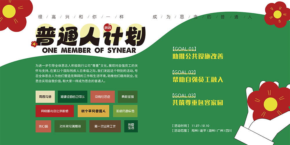 為進(jìn)一步傳播針對自強(qiáng)員工的“尊重”文化,引導(dǎo)全體思念人積極踐行“尊重”文化,展現(xiàn)對自強(qiáng)員工的關(guān)懷與支持,在第32個國際殘疾人日來臨之際,思念食品組織開展了面向全國各生產(chǎn)基地的自強(qiáng)員工關(guān)愛活動,號召全體思念人為他們營造無障礙的工作和生活環(huán)境,助推他們穩(wěn)崗就業(yè),在思念實現(xiàn)自我價值,和大家一樣成為思念的普通人。